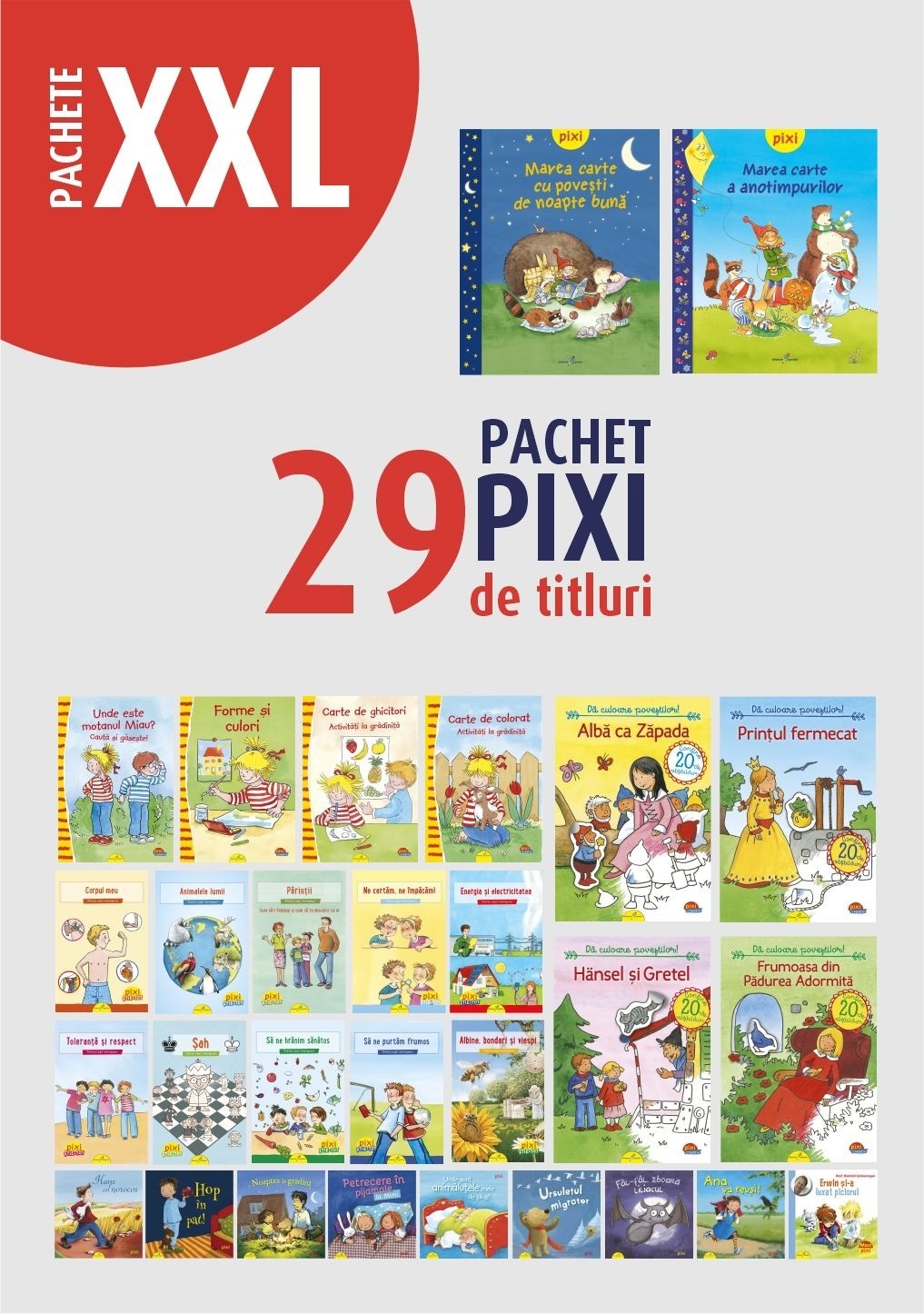 Pachetul cuprinde două ediții speciale, cartonate, care aduc împreună zeci de povești Pixi: Marea carte cu povești de noapte bună și Marea carte a anotimpurilor. De asemenea, aici găsiți și volume individuale cu cele mai simpatice povești pentru micii cititori, pline de culoare și de aventuri jucăușe.